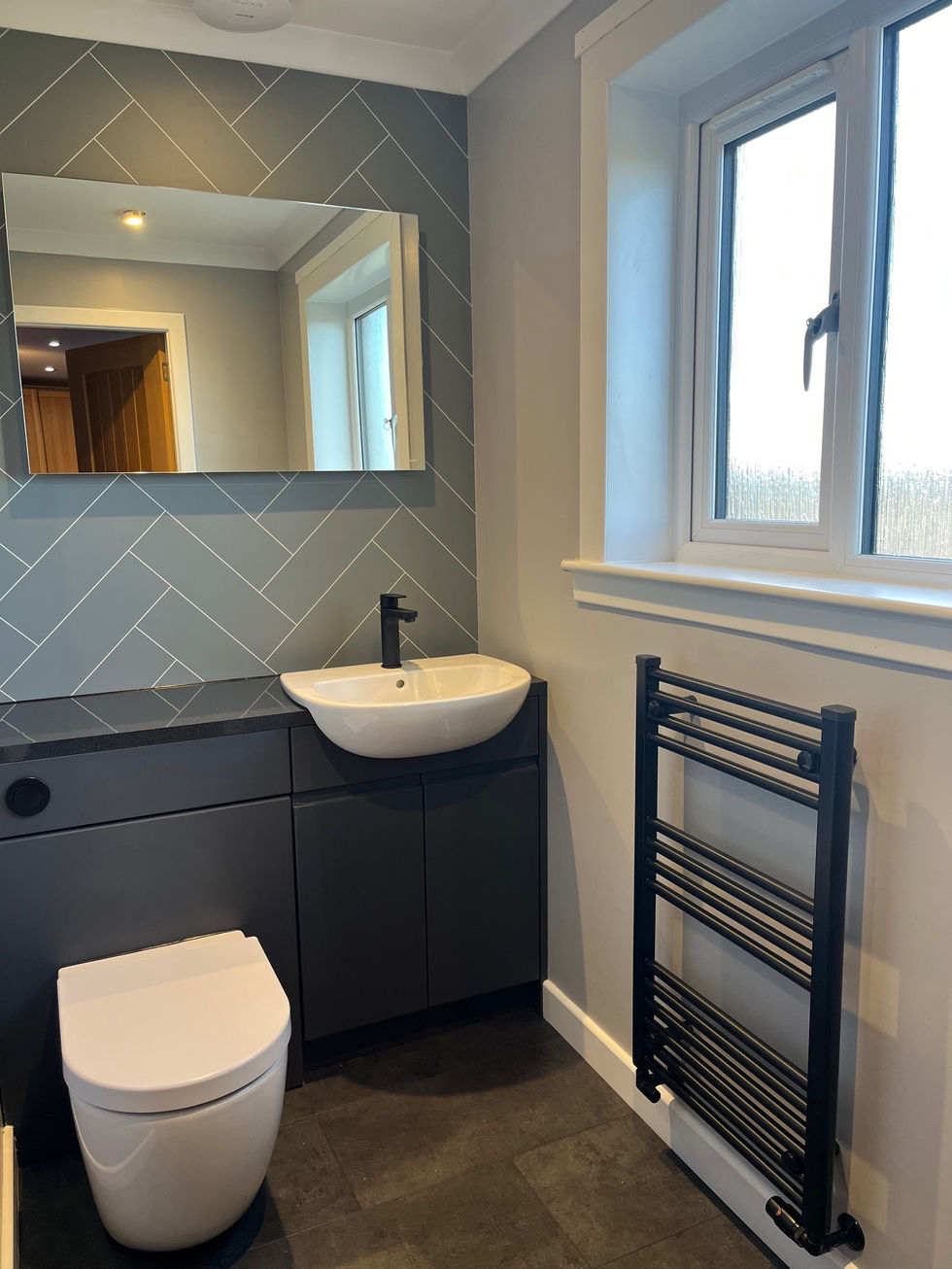 A complete renovation of a shower room to give a modern sleek look. Suite supplied by City Plumbing 101 Causewayend, Aberdeen and installed by us. We also plastered the ceiling and painted the bathroom to add the perfect finishing touch.